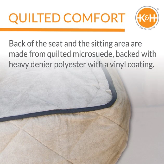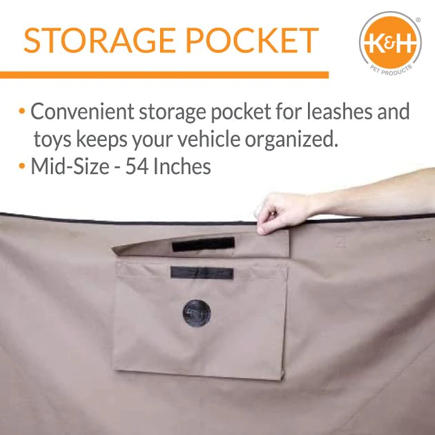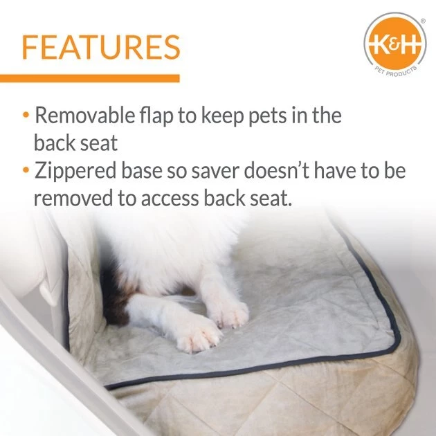 An extended and deluxe version of K&H’s Car Seat Cover. This combines a semi-fitted seat cover with removable flap, flap is designed to keep pet in the backseat. The back of the seat and the sitting area is quilted MicroSuede, backed with 600 denier nylon with a vinyl coating to keep seats clean. The waterproof backing keeps dirt and spills off the seat. There is a storage pocket for keeping leashes and toys. Available in one size, two colors.
