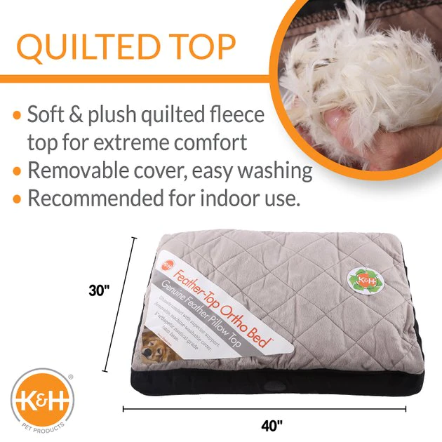 Your pet will sleep soundly on the K&H Pet Products Feather-Top Orthopedic Pet Bed. With a 5 inch medical grade foam base and a 1.5 inch baffled duck feather top complimented with micro-suede, this bed provides a deeper and more restful night’s sleep by gently cushioning your furry friend’s pressure points like his hips and shoulders. Between the cushioned sleeping surface and the comfort of the medical grade foam, your furbaby will be sleeping in luxury. Plus, the cover is removable making washing a breeze—just throw into the machine on a cold, gentle cycle.