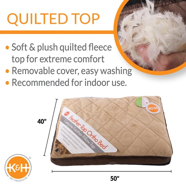 Your pet will sleep soundly on the K&H Pet Products Feather-Top Orthopedic Pet Bed. With a 5 inch medical grade foam base and a 1.5 inch baffled duck feather top complimented with micro-suede, this bed provides a deeper and more restful night’s sleep by gently cushioning your furry friend’s pressure points like his hips and shoulders. Between the cushioned sleeping surface and the comfort of the medical grade foam, your furbaby will be sleeping in luxury. Plus, the cover is removable making washing a breeze—just throw into the machine on a cold, gentle cycle.
