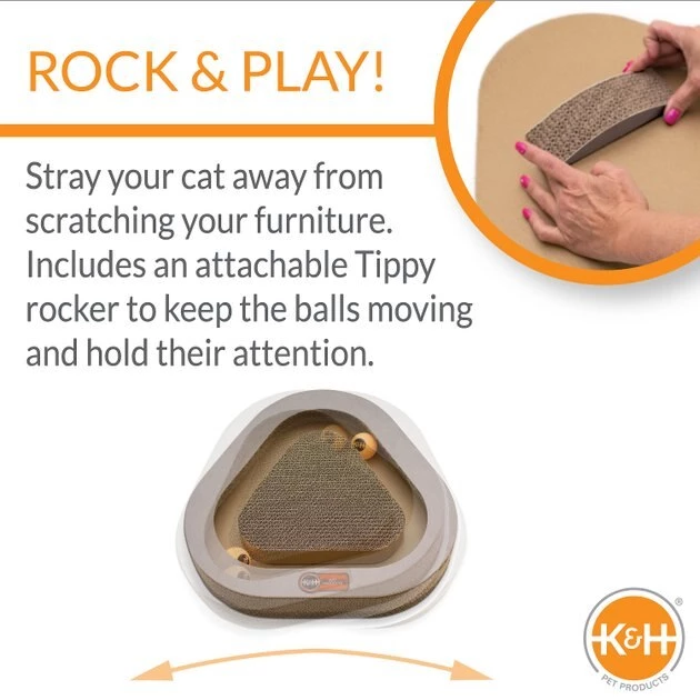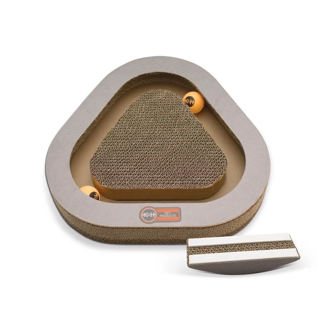 Your cat will be mesmerized by the K&H Pet Products Kitty Tippy Triangle Cardboard Scratcher Interactive Cat Toy. With a triangular shape and a built-in rocker that enables the toy to rock back and forth, while the two balls inside roll around, your cat will be delighted to get into the game. The middle scratching surface appeals to his clawing instincts, and the moving balls will satisfy his inner hunter—which equals hours of interactive fun for your playful pal. The included catnip further enhances the sensory experience, making it the best cat toy in the house. And if you ever want the toy to stay still, the rockers can easily be removed!