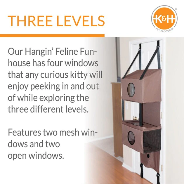 The K&H Pet Products Hangin’ Feline Funhouse provides your pet with her own purr-sonal space to climb, rest and play, but it uses less space than conventional cat trees. The Feline Funhouse can hang on just about any door, which means you don’t have to worry about it taking up your precious floor space! It features three levels, two mesh windows and two open windows. And for your cat’s safety, it comes with a simple bracket design that tightens from the bottom, purr-viding extra stability!