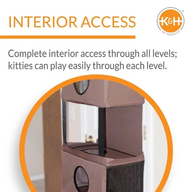 - The multi-level cat tower is designed with mesh windows and multiple peepholes, so your cat can take in all the views.