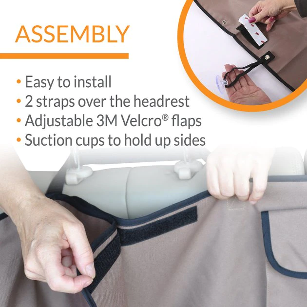 Run one side of the strap around the headrest, then connect it with the other end of the strap. This should be done for both rear headrests. The rear portion of the cover can connect to your vehicle using the included hook & loop fasteners or suctions cups.
