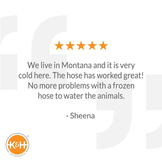 Keep just about everything clean with the K&H Pet Products Rubber Thermo-Hose. Thermostatically controlled, all you have to do is plug it in and heat the hose for 20 minutes—then you’ll have an ice-free, flexible hose to use. This quality hose will turn itself off during warmer weather, and there’s no need to drain in between uses! Disconnect from the permanent water supply when not in use, and the double-walled design with solid brass couplings will last for years to come. It’s perfect for use around the house and the farm!