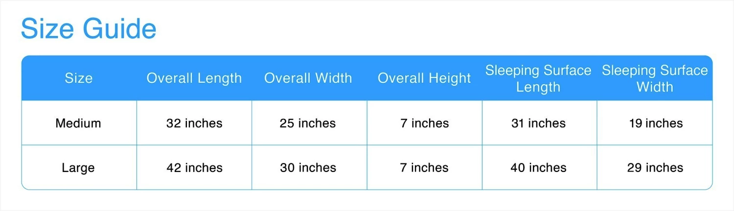 | Size | Overall Length | Overall Width | Overall Height | Sleeping Surface Length | Sleeping Surface Width |