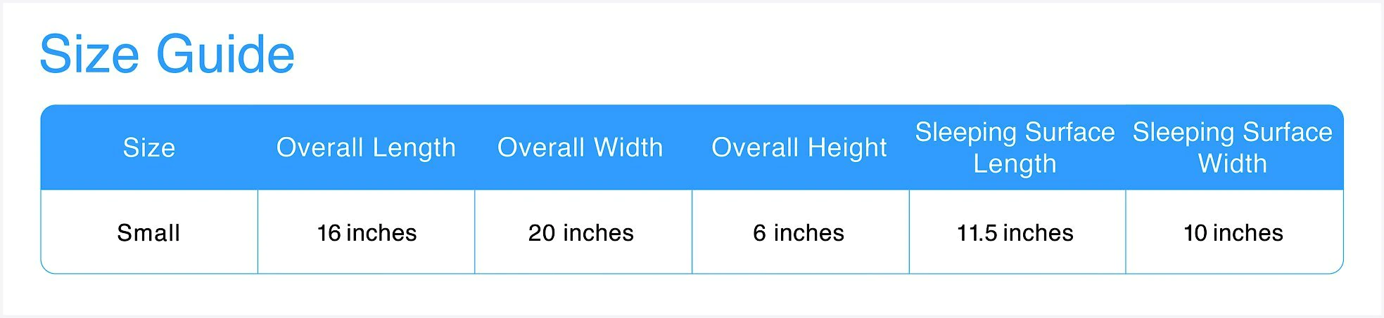 | Size | Overall Length | Overall Width | Overall Height | Sleeping Surface Length | Sleeping Surface Width |