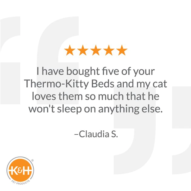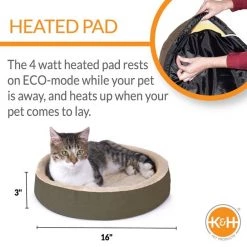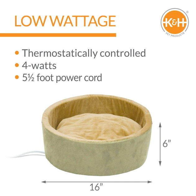 The K&H Thermo-Kitty Bed has a dual thermostat 4 watt heating unit buried deep within its thick, super soft, orthopedic foam base. It warms the surface 10‐15 degrees above ambient air temperature to your cat’s normal body temperature when in use. The washable cover is attractive in any room in the house. Indoor use only.