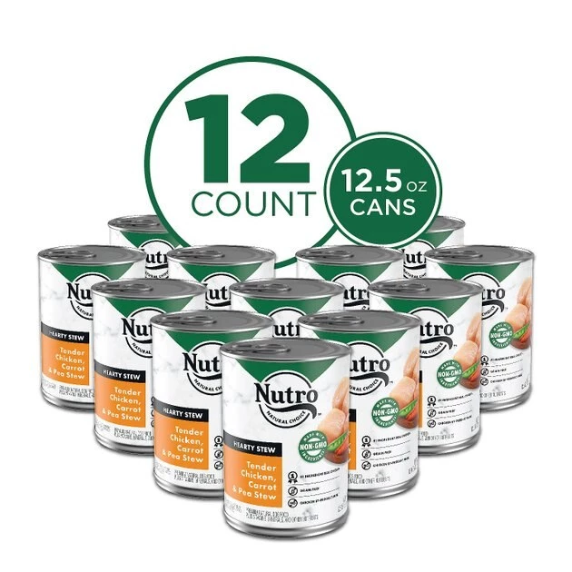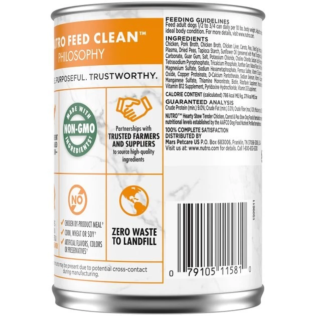 Watch your dog drool with delight over these Nutro Hearty Stew Tender Chicken, Carrot & Pea Stew Grain-Free Canned Dog Food. This premium wet dog food is full of nutrients and flavor that dogs—big and small—go crazy over. Each high-protein meal is balanced with vitamins and minerals and crafted with real chicken as the very first ingredient. Plus, with Nutro, you can feed your pal with confidence knowing that every ingredient is carefully sourced from a trusted network of farmers and suppliers and is 100% free of grains. gmos, chicken by-product meal, corn, soy, wheat, artificial colors, flavors or preservatives. Give your pal the nutrition he deserves and the taste he loves with Nutro.