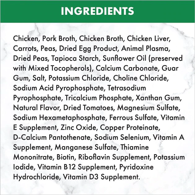 Chicken, Pork Broth, Chicken Broth, Chicken Liver, Carrots, Peas, Dried Egg Product, Animal Plasma, Dried Peas, Tapioca Starch, Sunflower Oil (preserved with Mixed Tocopherols), Calcium Carbonate, Guar Gum, Salt, Potassium Chloride, Choline Chloride, Sodium Acid Pyrophosphate, Tetrasodium Pyrophosphate, Tricalcium Phosphate, Xanthan Gum, Natural Flavor, Dried Tomatoes, Magnesium Sulfate, Sodium Hexametaphosphate, Ferrous Sulfate, Vitamin E Supplement, Zinc Oxide, Copper Proteinate, D-Calcium Pantothenate, Sodium Selenium, Vitamin A Supplement, Manganese Sulfate, Thiamine Mononitrate, Biotin, Riboflavin Supplement, Potassium Iodide, Vitamin B12 Supplement, Pyridoxine Hydrochloride, Vitamin D3 Supplement.