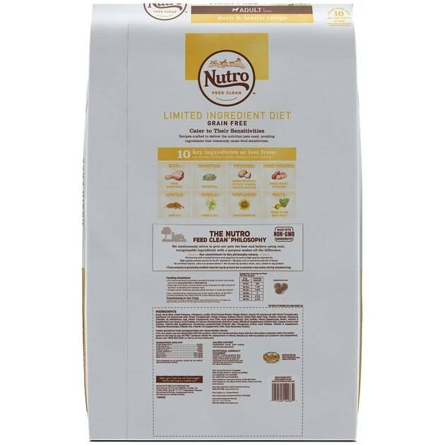 Nutro Limited Ingredient Diet Sensitive Support with Real Duck & Lentils Grain-Free Adult Dry Dog Food is paw-fect for pups with certain food sensitivities! Formulated with just 10 key, natural ingredients or less, Nutro’s Limited Ingredient Diet Sensitive Support recipes are made without ingredients that commonly cause food sensitivities in pets, like corn, wheat, soy, dairy protein, chicken and beef. This grain-free dog food is crafted with real ingredients, including duck and lentils. Not only does it deliver a taste that will get your dog’s tail to wag, but it also nourishes sensitive skin from the inside out, promoting a soft, shiny coat. And you can feel extra good knowing that this dry dog food follows the Nutro Feed Clean philosophy, so it’s made with non-GMO ingredients and zero artificial flavors colors or preservatives. Please note that trace amounts of genetically modified material might be present due to potential cross contact during manufacturing.