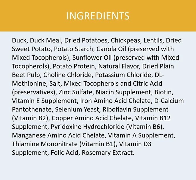 Duck, Duck Meal, Dried Potatoes, Chickpeas, Lentils, Dried Sweet Potato, Potato Starch, Canola Oil (Preserved With Mixed Tocopherols), Sunflower Oil (Preserved With Mixed Tocopherols), Potato Protein, Natural Flavor, Dried Plain Beet Pulp, Choline Chloride, Potassium Chloride, DL-Methionine, Salt, Mixed Tocopherols and Citric Acid (preservatives), Zinc Sulfate, Niacin Supplement, Biotin, Vitamin E Supplement, Iron Amino Acid Chelate, D-Calcium Pantothenate, Selenium Yeast, Riboflavin Supplement (Vitamin B2), Copper Amino Acid Chelate, Vitamin B12 Supplement, Pyridoxine Hydrochloride (Vitamin B6), Manganese Amino Acid Chelate, Vitamin A Supplement, Thiamine Mononitrate (Vitamin B1), Vitamin D3 Supplement, Folic Acid, Rosemary Extract