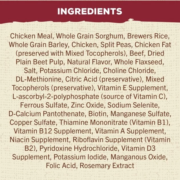 Chicken Meal, Whole Grain Sorghum, Brewers Rice, Whole Grain Barley, Chicken, Split Peas, Chicken Fat (preserved with Mixed Tocopherols), Beef, Dried Plain Beet Pulp, Natural Flavor, Whole Flaxseed, Salt, Potassium Chloride, Choline Chloride, DL-Methionine, Citric Acid (preservative), Mixed Tocopherols (preservative), Vitamin E Supplement, L-ascorbyl-2-polyphosphate (source of Vitamin C), Ferrous Sulfate, Zinc Oxide, Sodium Selenite, D-Calcium Pantothenate, Biotin, Manganese Sulfate, Copper Sulfate, Thiamine Mononitrate (Vitamin B1), Vitamin B12 Supplement, Vitamin A Supplement, Niacin Supplement, Riboflavin Supplement (Vitamin B2), Pyridoxine Hydrochloride, Vitamin D3 Supplement, Potassium Iodide, Manganous Oxide, Folic Acid, Rosemary Extract