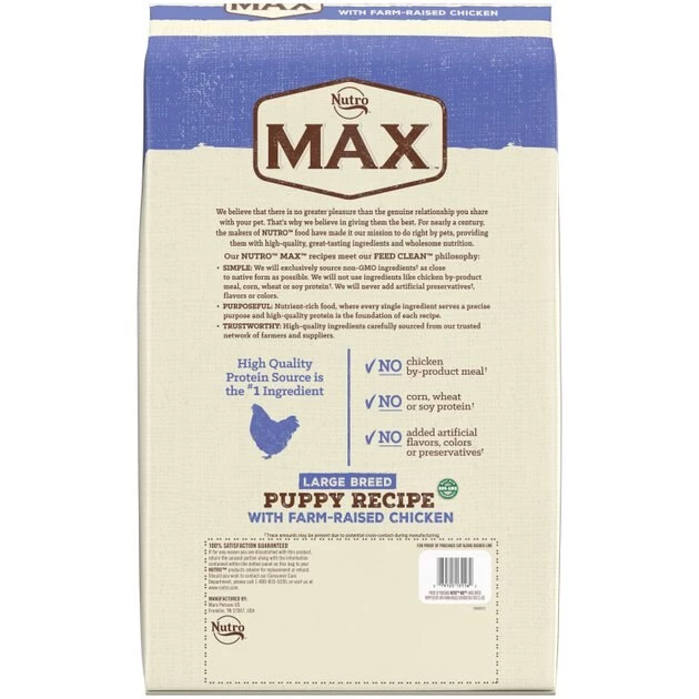 Treat your growing puppy to great-tasting nutrition with Nutro Max Large Breed Puppy Farm-Raised Chicken Recipe Natural Dry Dog Food. This pint-sized kibble is specially formulated for the unique dietary needs of large breed puppies. Each bite is packed with real, farm-raised chicken. It also contains natural fiber to aid in healthy digestion and omega fatty acids to support soft skin and a shiny coat. Plus, the crunchy texture helps clean your pup’s teeth as they chew. With every bowl of Nutro Max, you can trust that your little canine companion is getting the nutrition they deserve to help them live a full, healthy life. Proudly made in the USA using the world’s finest non-GMO ingredients.
