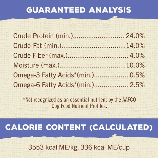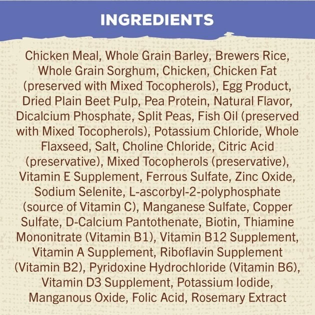 Chicken Meal, Whole Grain Barley, Brewers Rice, Whole Grain Sorghum, Chicken, Chicken Fat (preserved with Mixed Tocopherols), Egg Product, Dried Plain Beet Pulp, Pea Protein, Natural Flavor, Dicalcium Phosphate, Split Peas, Fish Oil (preserved with Mixed Tocopherols), Potassium Chloride, Whole Flaxseed, Salt, Choline Chloride, Citric Acid (preservative), Mixed Tocopherols (preservative), Vitamin E Supplement, Ferrous Sulfate, Zinc Oxide, Sodium Selenite, L-ascorbyl-2-polyphosphate (source of Vitamin C), Manganese Sulfate, Copper Sulfate, D-Calcium Pantothenate, Biotin, Thiamine Mononitrate (Vitamin B1), Vitamin B12 Supplement, Vitamin A Supplement, Riboflavin Supplement (Vitamin B2), Pyridoxine Hydrochloride (Vitamin B6), Vitamin D3 Supplement, Potassium Iodide, Manganous Oxide, Folic Acid, Rosemary Extract
