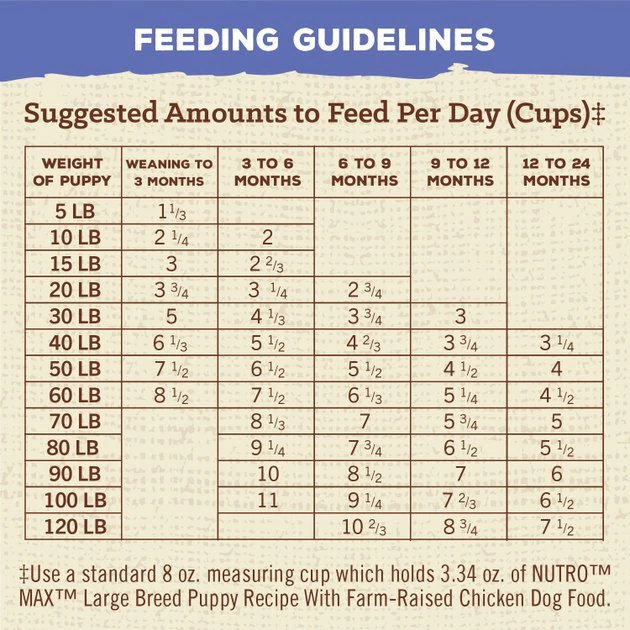 ‡Use a standard 8 oz. measuring cup which holds 3.34 oz. of NUTRO™ MAX™ Large Breed Puppy Recipe with Farm-Raised Chicken Dog Food.