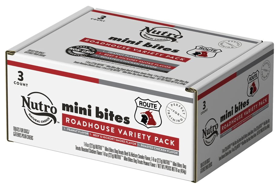 Treat your pal with the bite-sized chewy texture of Nutro Mini Bites Roadhouse Pack Dog Treats! This pack features three scrumptious recipes that start with real chicken or beef as the first ingredient. And with less than 3 calories per treat, Nutro Mini Bites are great as a training treat or anytime snack. These delectable bite-sized rewards are thoughtfully prepared in the USA and feature natural ingredients along with minerals and trace nutrients to support overall health. They use only non-GMO ingredients, and are free of common food allergens like corn, wheat and soy, which make them especially paw-fect for sensitive sidekicks. And because your dog’s treats should be as true as the bond you share, you’ll never find any artificial flavors, colors or preservatives in here! So, support your dog’s active and healthy lifestyle with a delicious tasting treat he will love!