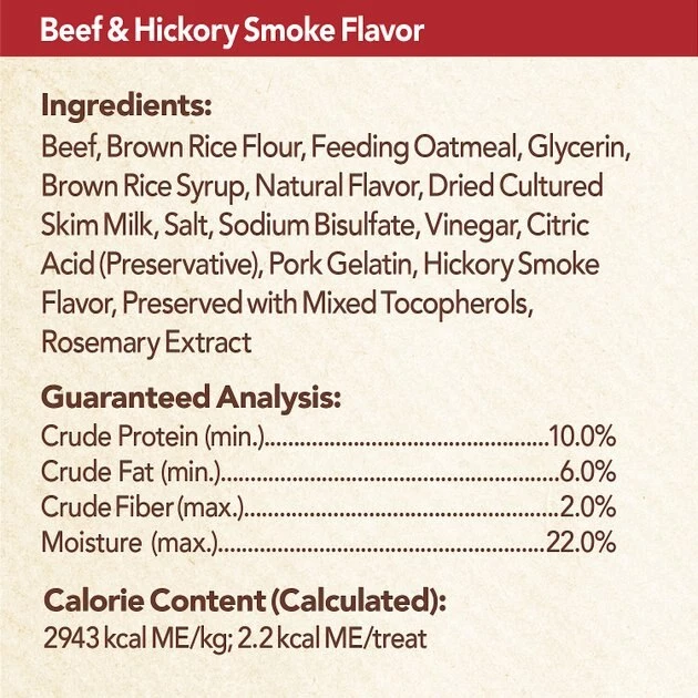 Beef, Brown Rice Flour, Feeding Oatmeal, Glycerin, Brown Rice Syrup, Natural Flavors, Salt, Dried Cultured Skim Milk, Sodium Bisulfate, Vinegar and Citric Acid (preservatives), Pork Gelatin, Hickory Smoke Flavor, Preserved with Mixed Tocopherols, Rosemary Extract.