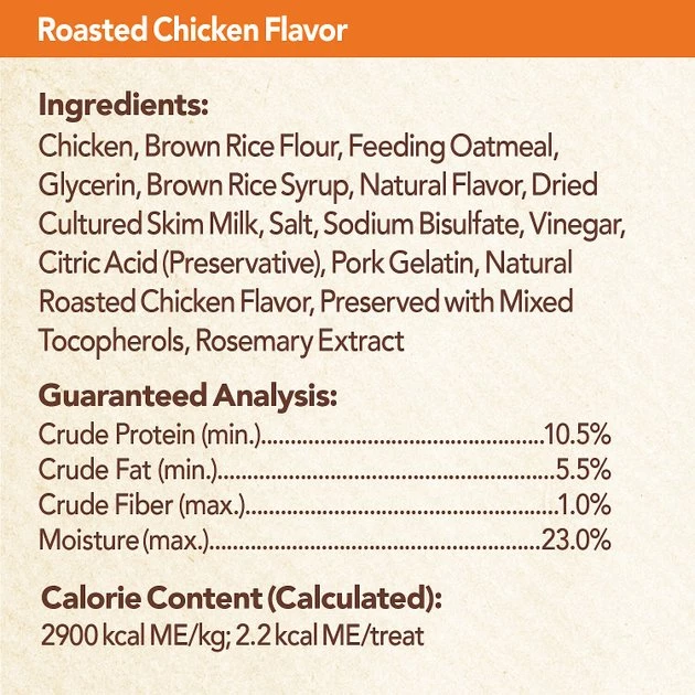 Chicken, Brown Rice Flour, Feeding Oatmeal, Glycerin, Brown Rice Syrup, Natural Flavors, Salt, Dried Cultured Skim Milk, Sodium Bisulfate, Pork Gelatin, Vinegar and Citric Acid (preservatives), Natural Roasted Chicken Flavor, Preserved with Mixed Tocopherols, Rosemary Extract.