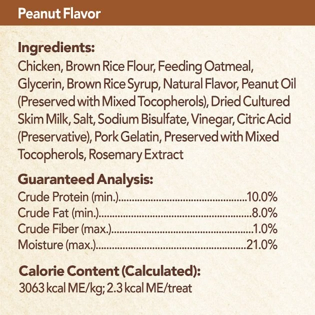 Chicken, Brown Rice Flour, Feeding Oatmeal, Glycerin, Brown Rice Syrup, Natural Flavors, Peanut Oil (preserved with mixed Tocopherols), Salt, Dried Cultured Skim Milk, Sodium Bisulfate, Vinegar and Citric Acid (preservatives), Pork Gelatin, Preserved with Mixed Tocopherols, Rosemary Extract.