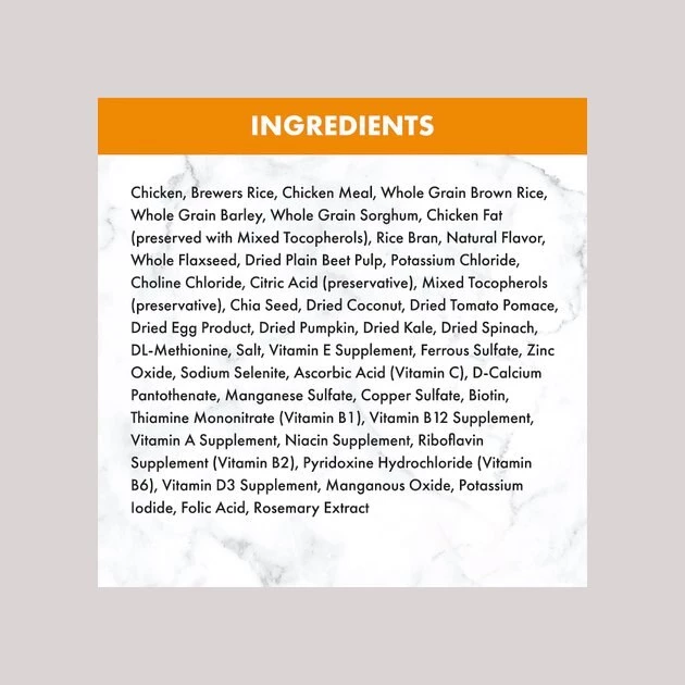 Chicken, Brewers Rice, Chicken Meal, Whole Grain Brown Rice, Whole Grain Barley, Whole Grain Sorghum, Chicken Fat (preserved with Mixed Tocopherols), Rice Bran, Natural Flavor, Whole Flaxseed, Dried Plain Beet Pulp, Potassium Chloride, Choline Chloride, Citric Acid (preservative), Mixed Tocopherols (preservative), Chia Seed, Dried Coconut, Dried Tomato Pomace, Dried Egg Product, Dried Pumpkin, Dried Kale, Dried Spinach, DL-Methionine, Salt, Vitamin E Supplement, Ferrous Sulfate, Zinc Oxide, Sodium Selenite, Ascorbic Acid (Vitamin C), D-Calcium Pantothenate, Manganese Sulfate, Copper Sulfate, Biotin, Thiamine Mononitrate (Vitamin B1), Vitamin B12 Supplement, Vitamin A Supplement, Niacin Supplement, Riboflavin Supplement (Vitamin B2), Pyridoxine Hydrochloride (Vitamin B6), Vitamin D3 Supplement, Manganous Oxide, Potassium Iodide, Folic Acid, Rosemary Extract.