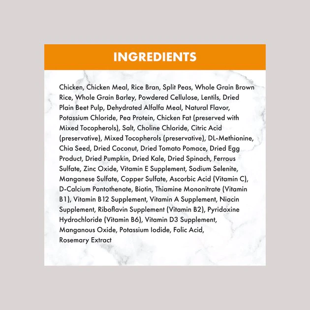 Chicken, Chicken Meal, Rice Bran, Split Peas, Whole Grain Brown Rice, Whole Grain Barley, Powdered Cellulose, Lentils, Dried Plain Beet Pulp, Dehydrated Alfalfa Meal, Natural Flavor, Potassium Chloride, Pea Protein, Chicken Fat (preserved with Mixed Tocopherols), Salt, Choline Chloride, Citric Acid (preservative), Mixed Tocopherols (preservative), DL-Methionine, Chia Seed, Dried Coconut, Dried Tomato Pomace, Dried Egg Product, Dried Pumpkin, Dried Kale, Dried Spinach, Ferrous Sulfate, Zinc Oxide, Vitamin E Supplement, Sodium Selenite, Manganese Sulfate, Copper Sulfate, Ascorbic Acid (Vitamin C), D-Calcium Pantothenate, Biotin, Thiamine Mononitrate (Vitamin B1), Vitamin B12 Supplement, Vitamin A Supplement, Niacin Supplement, Riboflavin Supplement (Vitamin B2), Pyridoxine Hydrochloride (Vitamin B6), Vitamin D3 Supplement, Manganous Oxide, Potassium Iodide, Folic Acid, Rosemary Extract.