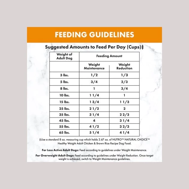 These are the recommended feeding amounts based on the ideal body condition for adult dogs of various weights. Individual dogs’ energy requirements may differ. Adjust the amount fed to obtain or maintain your dog’s optimum weight. Keep fresh drinking water available at all times, provide plenty of exercise and see your veterinarian regularly. Serve dry or lightly moistened.