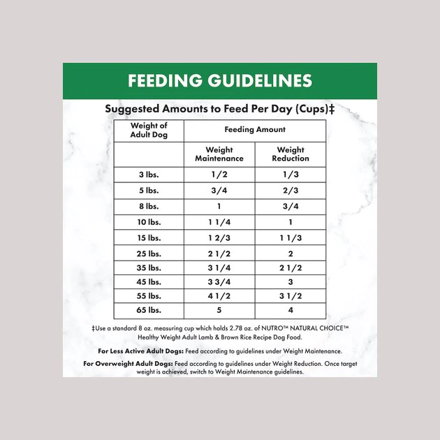 These are the recommended feeding amounts based on the ideal body condition for adult dogs of various weights. Individual dogs’ energy requirements may differ. Adjust the amount fed to obtain or maintain your dog’s optimum weight. Keep fresh drinking water available at all times, provide plenty of exercise and see your veterinarian regularly. Serve dry or lightly moistened.