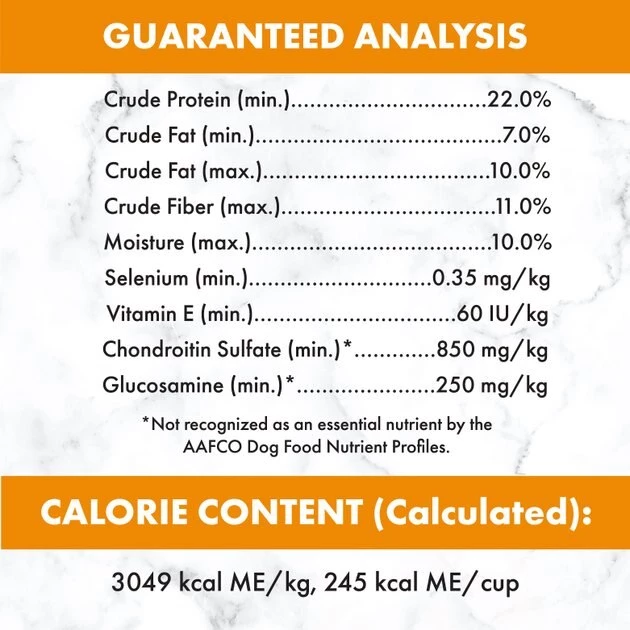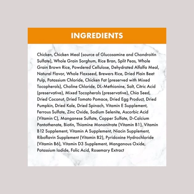Chicken, Chicken Meal (source of Glucosamine and Chondroitin Sulfate), Whole Grain Sorghum, Rice Bran, Split Peas, Whole Grain Brown Rice, Powdered Cellulose, Dehydrated Alfalfa Meal, Natural Flavor, Whole Flaxseed, Brewers Rice, Dried Plain Beet Pulp, Potassium Chloride, Chicken Fat (preserved with Mixed Tocopherols), Choline Chloride, DL-Methionine, Salt, Citric Acid (preservative), Mixed Tocopherols (preservative), Chia Seed, Dried Coconut, Dried Tomato Pomace, Dried Egg Product, Dried Pumpkin, Dried Kale, Dried Spinach, Vitamin E Supplement, Ferrous Sulfate, Zinc Oxide, Sodium Selenite, Ascorbic Acid (Vitamin C), Manganese Sulfate, Copper Sulfate, D-Calcium Pantothenate, Biotin, Thiamine Mononitrate (Vitamin B1), Vitamin B12 Supplement, Vitamin A Supplement, Niacin Supplement, Riboflavin Supplement (Vitamin B2), Pyridoxine Hydrochloride (Vitamin B6), Vitamin D3 Supplement, Manganous Oxide, Potassium Iodide, Folic Acid, Rosemary Extract.
