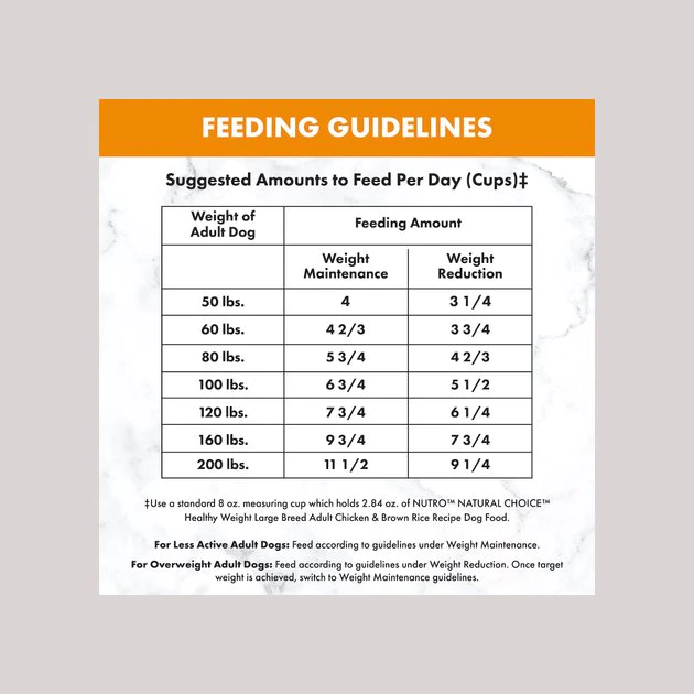 These are the recommended feeding amounts based on the ideal body condition for adult dogs of various weights. Individual dogs’ energy requirements may differ. Adjust the amount fed to obtain or maintain your dog’s optimum weight. Keep fresh drinking water available at all times, provide plenty of exercise and see your veterinarian regularly. Serve dry or lightly moistened.