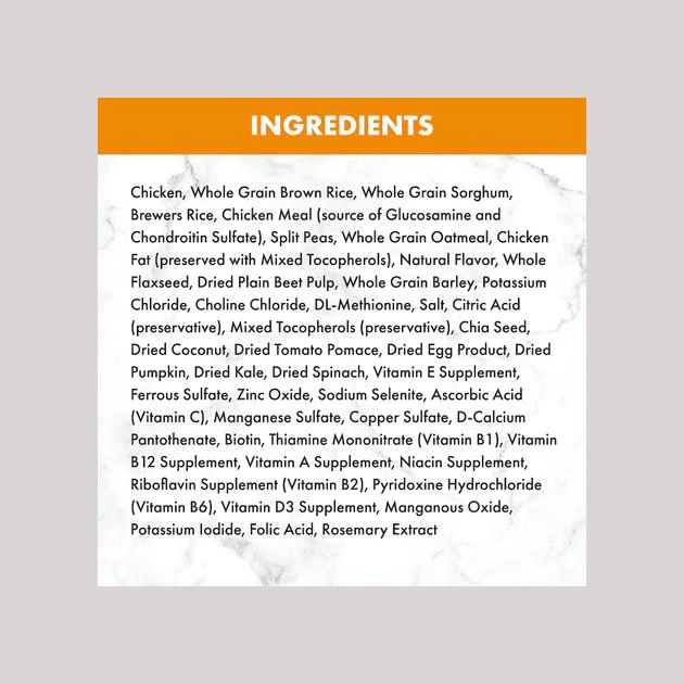 Chicken, Whole Grain Brown Rice, Whole Grain Sorghum, Brewers Rice, Chicken Meal (source of Glucosamine and Chondroitin Sulfate), Split Peas, Whole Grain Oatmeal, Chicken Fat (preserved with Mixed Tocopherols), Natural Flavor, Whole Flaxseed, Dried Plain Beet Pulp, Whole Grain Barley, Potassium Chloride, Choline Chloride, DL-Methionine, Salt, Citric Acid (preservative), Mixed Tocopherols (preservative), Chia Seed, Dried Coconut, Dried Tomato Pomace, Dried Egg Product, Dried Pumpkin, Dried Kale, Dried Spinach, Vitamin E Supplement, Ferrous Sulfate, Zinc Oxide, Sodium Selenite, Ascorbic Acid (Vitamin C), Manganese Sulfate, Copper Sulfate, D-Calcium Pantothenate, Biotin, Thiamine Mononitrate (Vitamin B1), Vitamin B12 Supplement, Vitamin A Supplement, Niacin Supplement, Riboflavin Supplement (Vitamin B2), Pyridoxine Hydrochloride (Vitamin B6), Vitamin D3 Supplement, Manganous Oxide, Potassium Iodide, Folic Acid, Rosemary Extract.