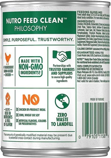 - Nutro Hearty Stew Tender Chicken, Carrot & Pea Stew Grain-Free Canned Dog Food features a savory gravy that dogs love, adding additional moisture to your pup’s diet.