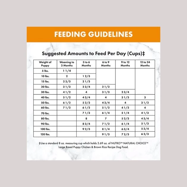 Adjust food to maintain ideal body weight. Always provide fresh drinking water. Puppies: From 3 to 5 weeks of age, moisten food and feed frequently. From 6 weeks of age, feed the suggested amount in three meals per day until 6 months of age, then twice daily until 18 months (24 months for giant size dogs). Gestation/Lactation: During gestation, feed up to 2 times the amount shown for puppies 6 to 9 months. Feed lactating females as much food as they will eat to maintain weight. Amounts will differ depending on litter size.