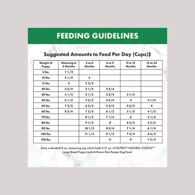 Adjust food to maintain ideal body weight. Always provide fresh drinking water. Puppies: From 3 to 5 weeks of age, moisten food and feed frequently. From 6 weeks of age, feed the suggested amount in three meals per day until 6 months of age, then twice daily until 18 months (24 months for giant size dogs). Gestation/Lactation: During gestation, feed up to 2 times the amount shown for puppies 6 to 9 months. Feed lactating females as much food as they will eat to maintain weight. Amounts will differ depending on litter size.