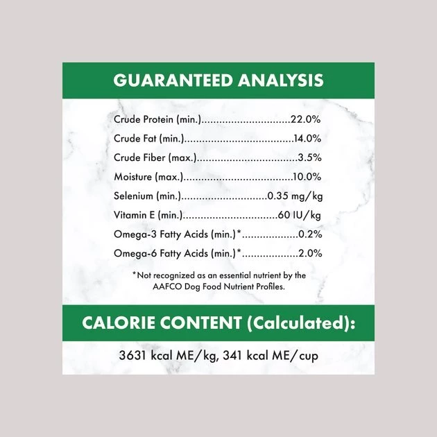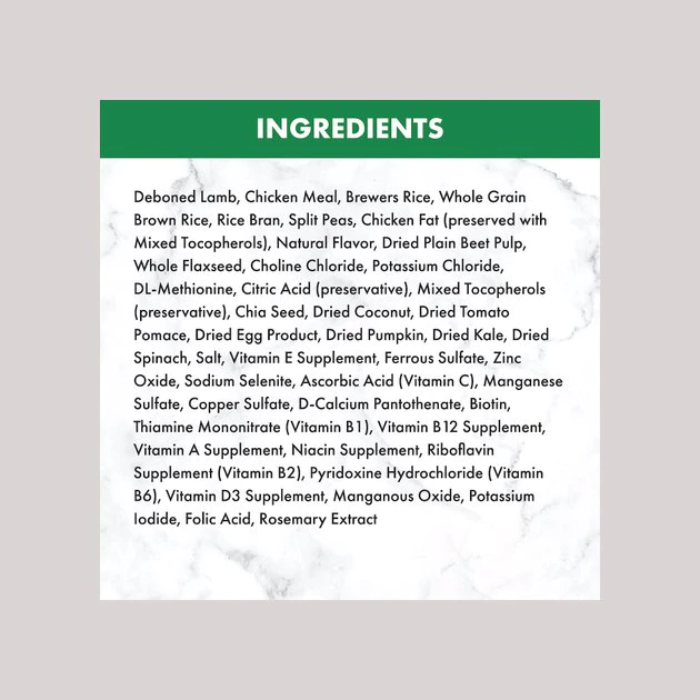 Deboned Lamb, Chicken Meal, Brewers Rice, Whole Grain Brown Rice, Rice Bran, Split Peas, Chicken Fat (preserved with Mixed Tocopherols), Natural Flavor, Dried Plain Beet Pulp, Whole Flaxseed, Choline Chloride, Potassium Chloride, DL-Methionine, Citric Acid (preservative), Mixed Tocopherols (preservative), Chia Seed, Dried Coconut, Dried Tomato Pomace, Dried Egg Product, Dried Pumpkin, Dried Kale, Dried Spinach, Salt, Vitamin E Supplement, Ferrous Sulfate, Zinc Oxide, Sodium Selenite, Ascorbic Acid (Vitamin C), Manganese Sulfate, Copper Sulfate, D-Calcium Pantothenate, Biotin, Thiamine Mononitrate (Vitamin B1), Vitamin B12 Supplement, Vitamin A Supplement, Niacin Supplement, Riboflavin Supplement (Vitamin B2), Pyridoxine Hydrochloride (Vitamin B6), Vitamin D3 Supplement, Manganous Oxide, Potassium Iodide, Folic Acid, Rosemary Extract.