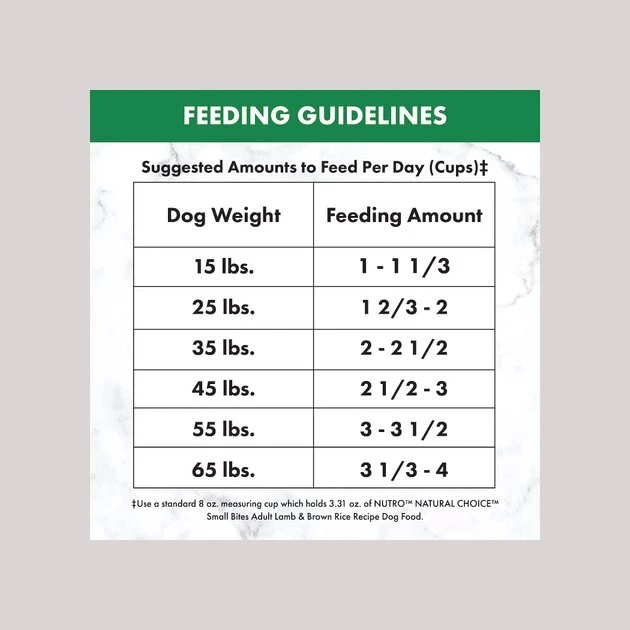 These are the recommended feeding amounts based on the ideal body condition for adult dogs of various weights. Individual dogs’ energy requirements may differ. Adjust the amount fed to obtain or maintain your dog’s optimum weight. Keep fresh drinking water available at all times, provide plenty of exercise and see your veterinarian regularly. Serve dry or lightly moistened.