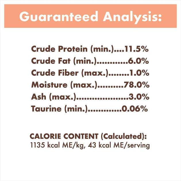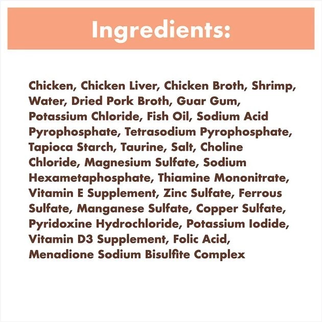 Chicken, Chicken Liver, Pork Broth, Chicken Broth, Shrimp, Natural Flavor, Guar Gum, Potassium Chloride, Fish Oil (preserved with Mixed Tocopherols), Sodium Acid Pyrophosphate, Tetrasodium Pyrophosphate, Tapioca Starch, Salt, Taurine, Choline Chloride, Magnesium Sulfate, Sodium Hexametaphosphate, Thiamine Mononitrate (Vitamin B1), Vitamin E Supplement, Zinc Sulfate, Ferrous Sulfate, Manganese Sulfate, Potassium Iodide, Pyridoxine Hydrochloride (Vitamin B6), Copper Sulfate, Vitamin D3 Supplement, Folic Acid, Menadione Sodium Bisulfite Complex (source of Vitamin K Activity).