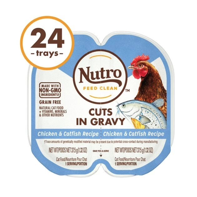 Your kitty goes wild for real meat, so give him the nutrition he craves with Nutro Perfect Portions Grain-Free Chicken & Catfish Recipe Cuts in Gravy Adult Cat Food Trays. This soft, delectable cat food features high-quality chicken and catfish in a whisker-licking broth without adding any artificial flavors, colors, or preservatives. Nutro believes that real and recognizable ingredients make all the difference, so these easy-peel meals are made with savory meat from trusted farmers. Because they’re grain-free, they’re perfect for cats with sensitivities to grains, and you can trust that every ingredient in this delicious and nutrient-rich cat food serves a purpose. Serve Nutro Perfect Portions on a plate and watch your cat lap it up with delight.
