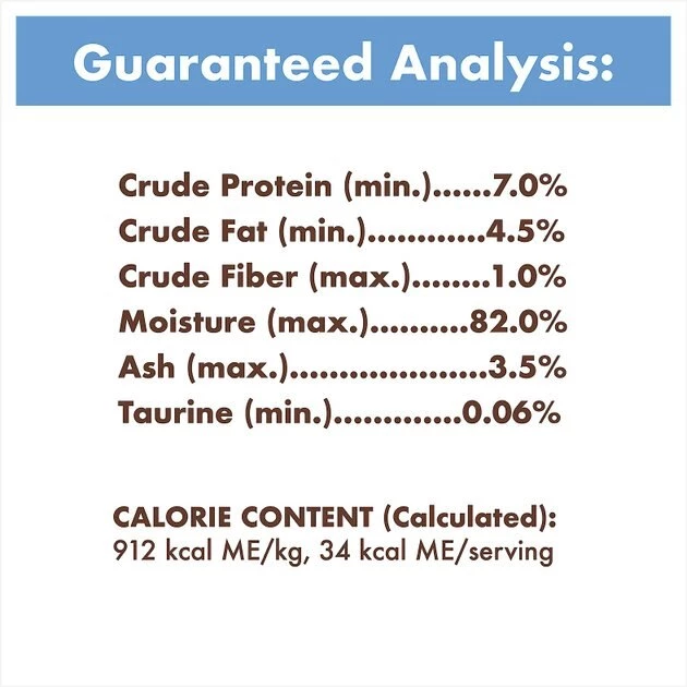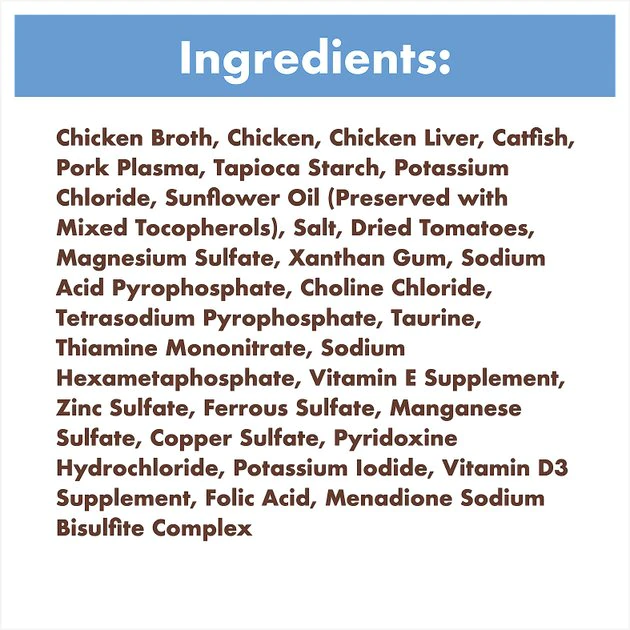 Chicken Broth, Chicken, Chicken Liver, Catfish, Pork Plasma, Tapioca Starch, Potassium Chloride, Sunflower Oil (preserved with Mixed Tocopherols), Salt, Dried Tomato, Magnesium Sulfate, Xanthan Gum, Sodium Acid Pyrophosphate, Tetrasodium Pyrophosphate, Choline Chloride, Sodium Hexametaphosphate, Taurine, Thiamine Mononitrate, Vitamin E Supplement, Zinc Sulfate, Ferrous Sulfate, Manganese Sulfate, Copper Sulfate, Pyridoxine Hydrochloride, Potassium Iodide, Vitamin D3 Supplement, Folic Acid, Menadione Sodium Bisulfite Complex