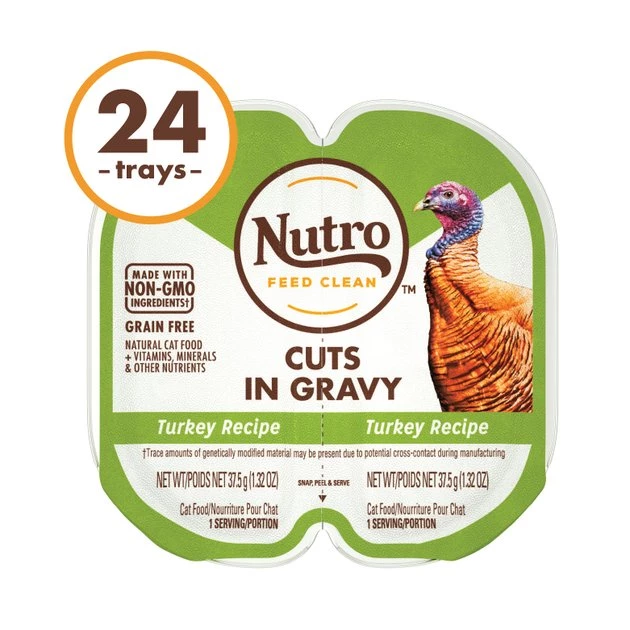 There are no more leftovers when you’re feeding your four-legged friend Nutro Perfect Portions Grain-Free Cuts in Gravy Real Turkey Recipe Cat Food Trays. Made with real turkey in a delectable gravy, this grain-free cat food contains no artificial flavors, colors or preservatives and no corn, wheat or soy. The convenient twin-pack tubs are designed to be split into two for easy serving with no open cans smelling up the fridge. These savory chunks are formulated to provide complete and balanced nutrition as a complete meal or an enticing topper to add variety to her dry kibble.