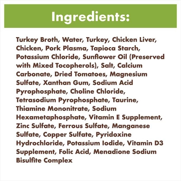 Turkey Broth, Turkey, Chicken, Chicken Liver, Pork Plasma, Tapioca Starch, Potassium Chloride, Sunflower Oil (preserved with Mixed Tocopherols), Salt, Dried Tomatoes, Magnesium Sulfate, Xanthan Gum, Sodium Acid Pyrophosphate, Tetrasodium Pyrophosphate, Choline Chloride, Sodium Hexametaphosphate, Taurine,Thiamine Mononitrate (Vitamin B1), Vitamin E Supplement, Zinc Sulfate, Ferrous Sulfate, Manganese Sulfate, Potassium Iodide, Pyridoxine Hydrochloride (Vitamin B6), Copper Sulfate, Vitamin D3 Supplement, Folic Acid, Menadione Sodium Bisulfite Complex (Source of Vitamin K Activity).