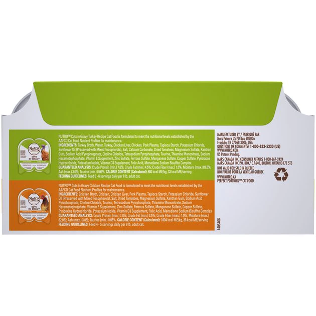 There are no more leftovers when you’re feeding your furry feline Nutro Perfect Portions Grain-Free Multi-Pack Real Turkey & Real Chicken Cuts in Gravy Recipe Cat Food Trays. Made with real meat protein in a delectable gravy, this grain-free cat food contains no artificial flavors, colors or preservatives and no corn, wheat or soy. The convenient twin-pack tubs are designed to be split into two for easy serving with no open cans smelling up the fridge. These savory chunks are formulated to provide complete and balanced nutrition as a complete meal or an enticing topper to add variety to his dry kibble.