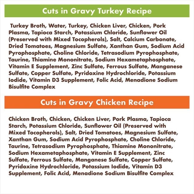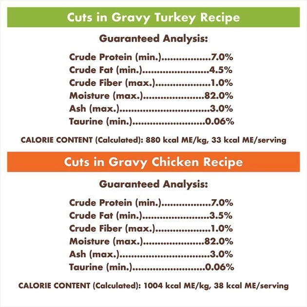 - Variety pack includes six twin-packs of Grain-Free Real Turkey Cuts in Gravy Recipe and six twin-packs of Grain-Free Real Chicken Cuts in Gravy Recipe.