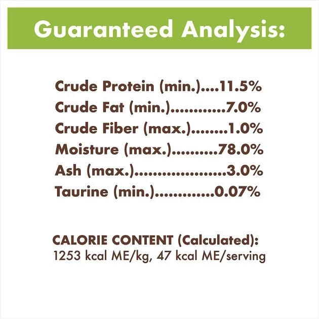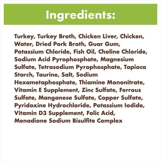 Turkey, Chicken Liver, Pork Broth, Turkey Broth, Natural Flavor, Guar Gum, Potassium Chloride, Fish Oil (preserved with Mixed Tocopherols), Sodium Acid Pyrophosphate, Magnesium Sulfate, Tetrasodium Pyrophosphate, Tapioca Starch, Choline Chloride, Salt, Taurine, Sodium Hexametaphosphate, Thiamine Mononitrate (Vitamin B1), Vitamin E Supplement, Zinc Sulfate, Ferrous Sulfate, Manganese Sulfate, Potassium Iodide, Pyridoxine Hydrochloride (Vitamin B6), Copper Sulfate, Vitamin D3 Supplement, Folic Acid, Menadione Sodium Bisulfite Complex (source of Vitamin K Activity).