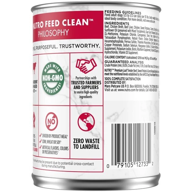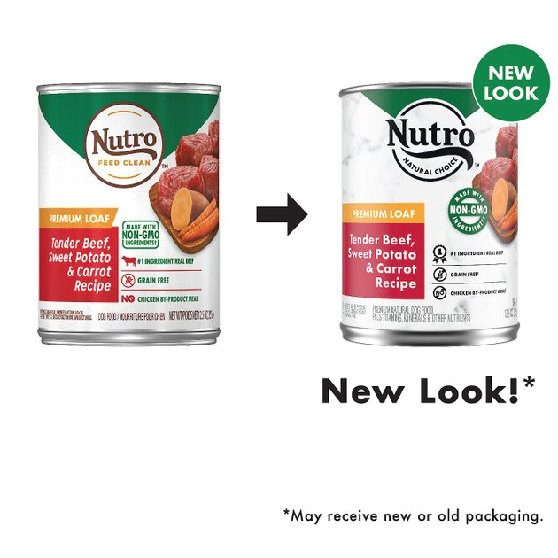 Watch your dog drool with delight over these Nutro Grain-Free Tender Beef, Sweet Potato & Carrot Recipe canned dog food! This premium, grain free wet dog food is full of nutrients and flavor that dogs—big and small—go crazy over. Each high-protein meal is balanced with vitamins and minerals and crafted with real beef as the very first ingredient! Plus, with Nutro, you can feed your pal with confidence knowing that every ingredient is carefully sourced from a trusted network of farmers and suppliers and is 100% free of chicken by-product meal, corn, soy, wheat, artificial colors, flavors or preservatives. Give your pal the nutrition he deserves and the taste he loves with Nutro!