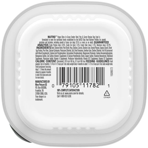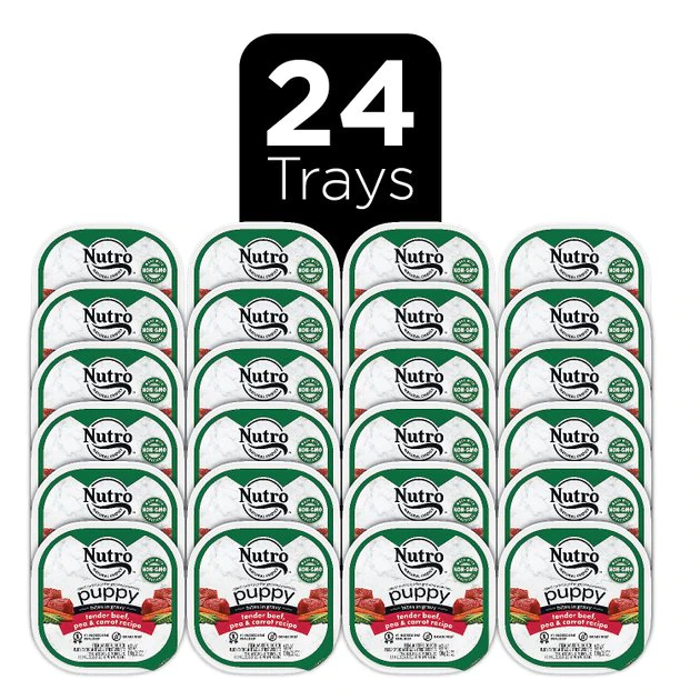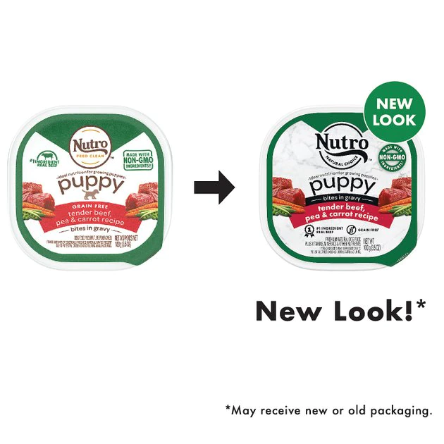 Watch your new pup drool with delight over these Nutro Puppy Tender Beef, Pea & Carrot Recipe dog food trays. This premium, grain free wet dog food is full of nutrients and flavor that puppies—big and small—go crazy over. Each high-protein meal is balanced with vitamins and minerals and crafted with real beef as the very first ingredient. Plus, with Nutro, you can feed your pal with confidence knowing that every ingredient is carefully sourced from a trusted network of farmers and suppliers and is 100% free of chicken by-product meal, corn, soy, wheat, artificial colors, flavors or preservatives. Give your pal the nutrition he deserves and the taste he loves with Nutro.