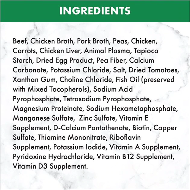 Beef, Chicken Broth, Pork Broth, Peas, Chicken, Carrots, Chicken Liver, Animal Plasma, Tapioca Starch, Dried Egg Product, Pea Fiber, Calcium Carbonate, Potassium Chloride, Salt, Dried Tomatoes, Xanthan Gum, Choline Chloride, Fish Oil (preserved with Mixed Tocopherols), Sodium Acid Pyrophosphate, Tetrasodium Pyrophosphate, Magnesium Proteinate, Sodium Hexametaphosphate, Manganese Sulfate, Zinc Sulfate, Vitamin E Supplement, D-Calcium Pantothenate, Biotin, Copper Sulfate, Thiamine Mononitrate, Riboflavin Supplement, Potassium Iodide, Vitamin A Supplement, Pyridoxine Hydrochloride, Vitamin B12 Supplement, Vitamin D3 Supplement.