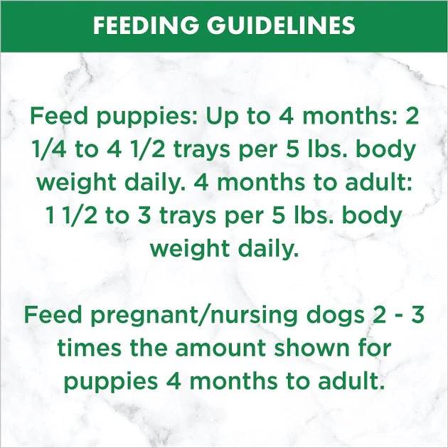 Feed Puppies Up to 4 months: 2 1/4 to 4 1/2 trays per 5 lbs. body weight daily.
