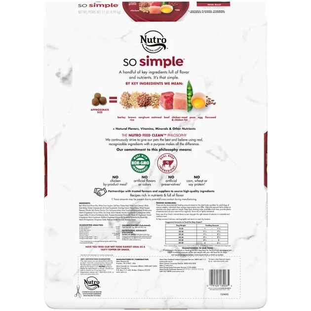 Feeding your dog healthfully and deliciously should be simple–and it is when you bring home Nutro SO SIMPLE Adult Beef Flavor Dry Dog Food. This adult dry kibble is made from a small number of key ingredients such as beef, whole grains, peas, eggs, chicken, and flaxseed along with vitamins and minerals. It is free from corn, wheat, soy protein, and any chicken by-product meal.