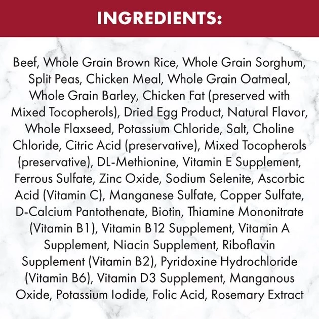 Beef, Whole Grain Brown Rice, Whole Grain Sorghum, Split Peas, Chicken Meal, Whole Grain Oatmeal, Whole Grain Barley, Chicken Fat (Preserved With Mixed Tocopherols), Dried Egg Product, Natural Flavor, Whole Flaxseed, Potassium Chloride, Salt, Choline Chloride, Citric Acid (Preservative), Mixed Tocopherols (Preservative), DL-Methionine, Vitamin E Supplement, Ferrous Sulfate, Zinc Oxide, Sodium Selenite, Ascorbic Acid (Vitamin C), Manganese Sulfate, Copper Sulfate, D-Calcium Pantothenate, Biotin, Thiamine Mononitrate (Vitamin B1), Vitamin B12 Supplement, Vitamin A Supplement, Niacin Supplement, Riboflavin Supplement (Vitamin B2), Pyridoxine Hydrochloride (Vitamin B6), Vitamin D3 Supplement, Manganous Oxide, Potassium Iodide, Folic Acid, Rosemary Extract.