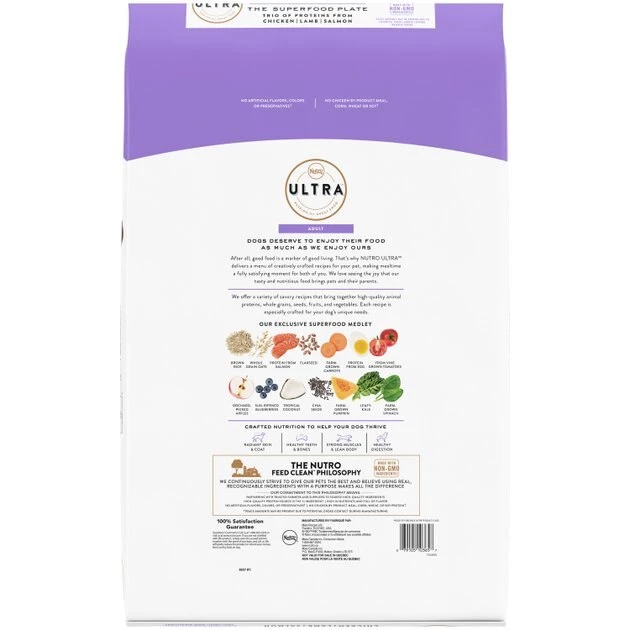 Make your best bud’s mealtime nutritious and delicious with Nutro Ultra Adult Dry Dog Food. Specially formulated for adult dogs, these tasty, dry recipes start with real chicken as the main ingredient—no chicken by-product meal here. Add lamb, salmon, and a blend of 15 superfoods and you have a mouthwatering, healthy meal. Sourced from trusted farmers, the high quality, non-GMO ingredients provide a balanced, nutrient rich diet that will help your dog thrive. Plus there are no artificial flavors, colors, or preservatives and it is free of corn, wheat, and soy protein. Your favorite furball will love to eat this flavorful, nourishing kibble!